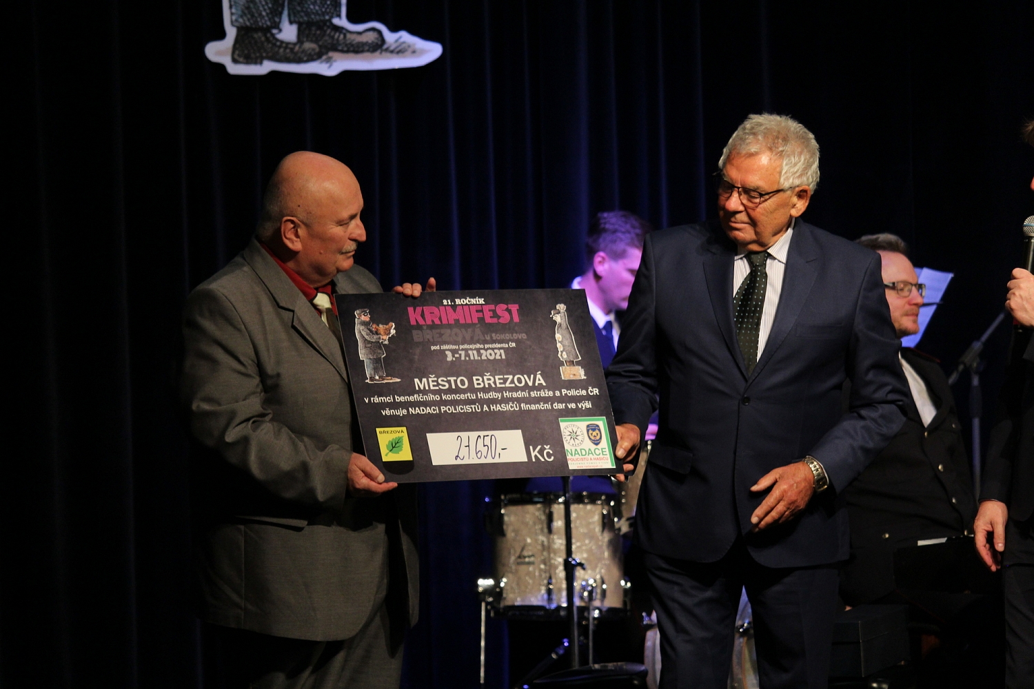 Slavnostním zahájením celého festivalu byl již tradičně středeční benefiční koncert big bandu Hudby Hradní stráže a Policie ČR, během kterého v kinosále spolu s oblíbeným hudebním tělesem vystoupila sólistka Ivana Brožová. V rámci koncertu, který moderoval Petr Čimpera, předal starosta města Březová p. Miroslav Bouda řediteli Nadace policistů a hasičů PhDr. Vladimíru Šuterovi, CSc. symbolický šek s finančním darem. Benefici okomentoval vedoucí Kulturního domu a zástupce pořadatele Mgr. Michal Bedeč: „Koncert Hudby Hradní stráže a Policie ČR patřil v uplynulých ročnících KRIMIFESTU vždy k jeho neodlučitelným stálicím, proto jsme rádi, že se nám tuto tradici daří i nadále dodržovat. A navíc když jsme i samotným koncertem mohli pomoci potřebným, v tomto případě opět Nadaci policistů a hasičů, která se stará o pozůstalé po policistech a hasičích, kteří padli při výkonu služby. Celkem se na vstupném a na dobrovolných příspěvcích podařilo vybrat pěknou částku 21.650 Kč, za což bych rád poděkoval všem přítomným návštěvníkům, kteří se tak na finančním daru podíleli. Vedení města Březová nakonec darovanou částku zdvojnásobilo a Nadaci tedy věnuje skvělou sumu 43.300 Kč.“