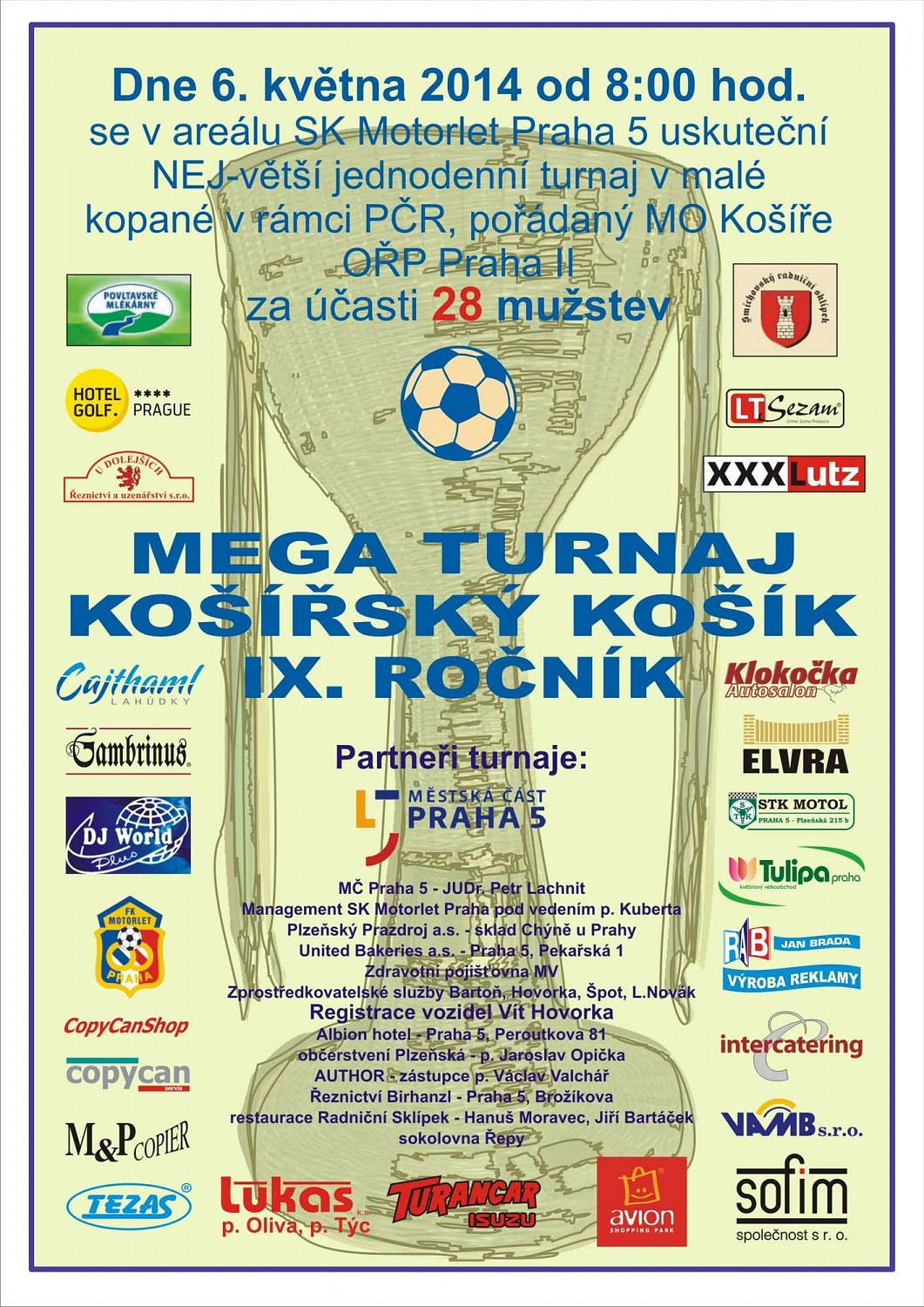 Dne 6. května 2014 od 8:00 hod. se v areálu SK Motorlet Praha 5 uskuteční jednodenní turnaj policistů v malé kopané v rámci PČR, pořádaný MO Košíře OŘP Praha II, za účasti 28 mužstev.