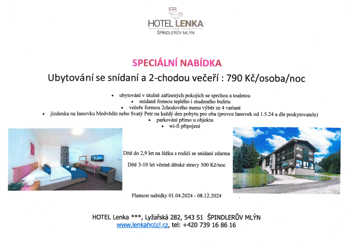 Jako poděkování všem, kteří přispívají finanční částkou na účet Nadace policistů a hasičů nabízíme možnost ubytování v hotelu Lenka ve Špindlerově Mlýně za cenu 790,-Kč se snídaní a dvouchodou večeří na osobu a noc. Dítě do 3 let zdarma a dítě 3-10 let platí 500,-Kč včetně dětské stravy.