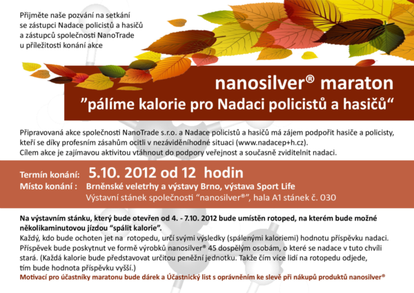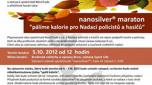 Vyvrcholení připravované akce "pálíme kalorie pro Nadaci policistů a hasičů" nebo-li maraton několikaminutové jízdy na rotopedu, společnosti Nano Trade s.r.o., nanosilver, se uskuteční 5. 10. 2012 od 12 hodin s místem konání Brněnské veletrhy a výstavy Brno, výstava Sport Life, hala A1 stánek č. 030.