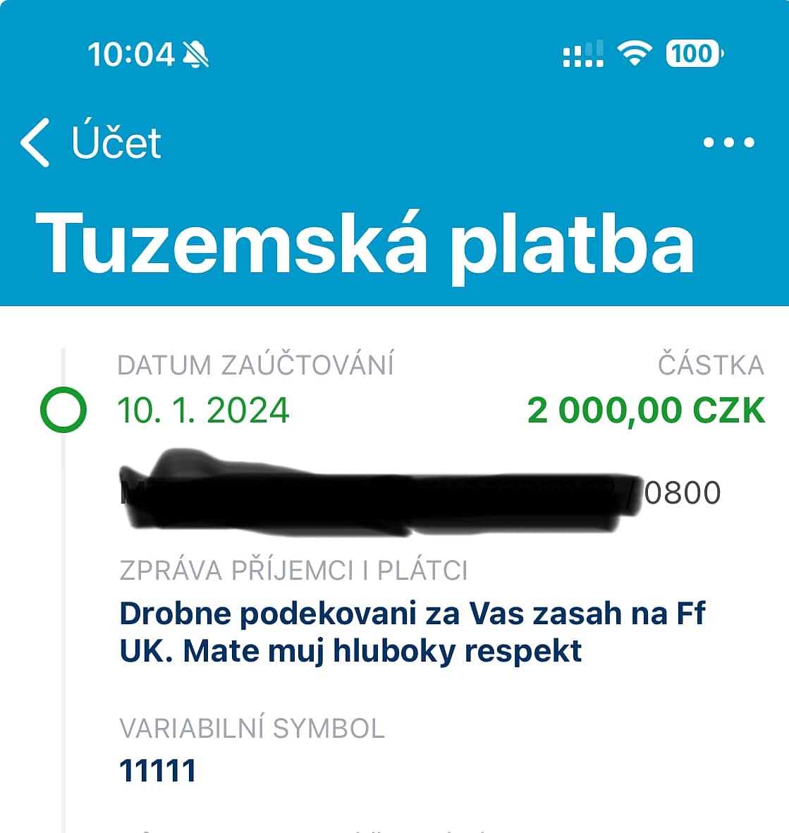 Na účtu Nadace PaH se objevila tato platba. Nejzajímavější na ní je zpráva pro příjemce. Moc si vážíme podpory a solidarity dárce. Takováto forma poděkování není častá a zcela jistě bude policistům tlumočena.