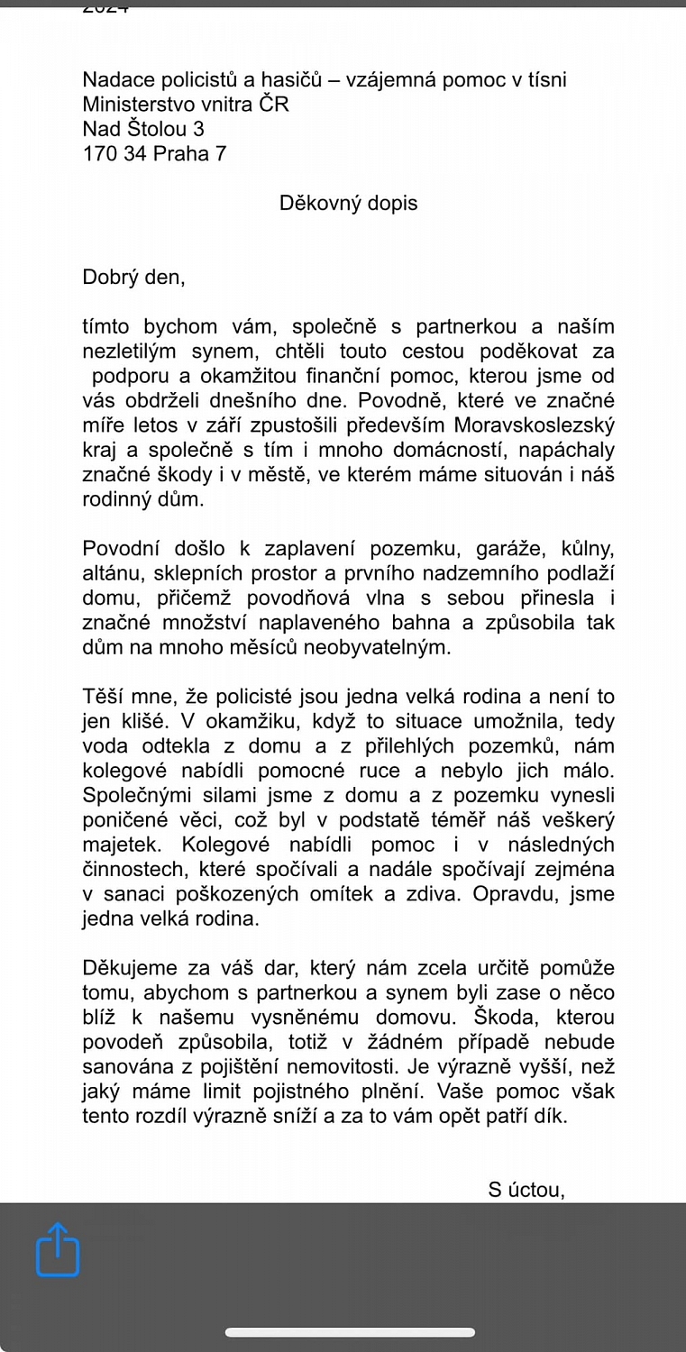 V souvislosti se zářijovými povodněmi se na nadaci PaH obrátilo celkem 154 policistů a hasičů o pomoc v tíživé životní situaci. Dnes byly vyplaceny peníze poškozeným, kteří splnily podmínky pro tuto pomoc. Podmínky pomoci byly stanoveny na společném zasedání Správní a Dozorčí rady Nadace policistů a hasičů - vzájemná pomoc v tísni s cílem zajistit co největší objektivitu a rychlost rozdělení finančních prostředků. A poděkování od poškozených na sebe nenechalo dlouho čekat. Tak úplně to první přikládám.