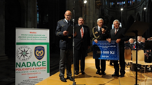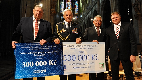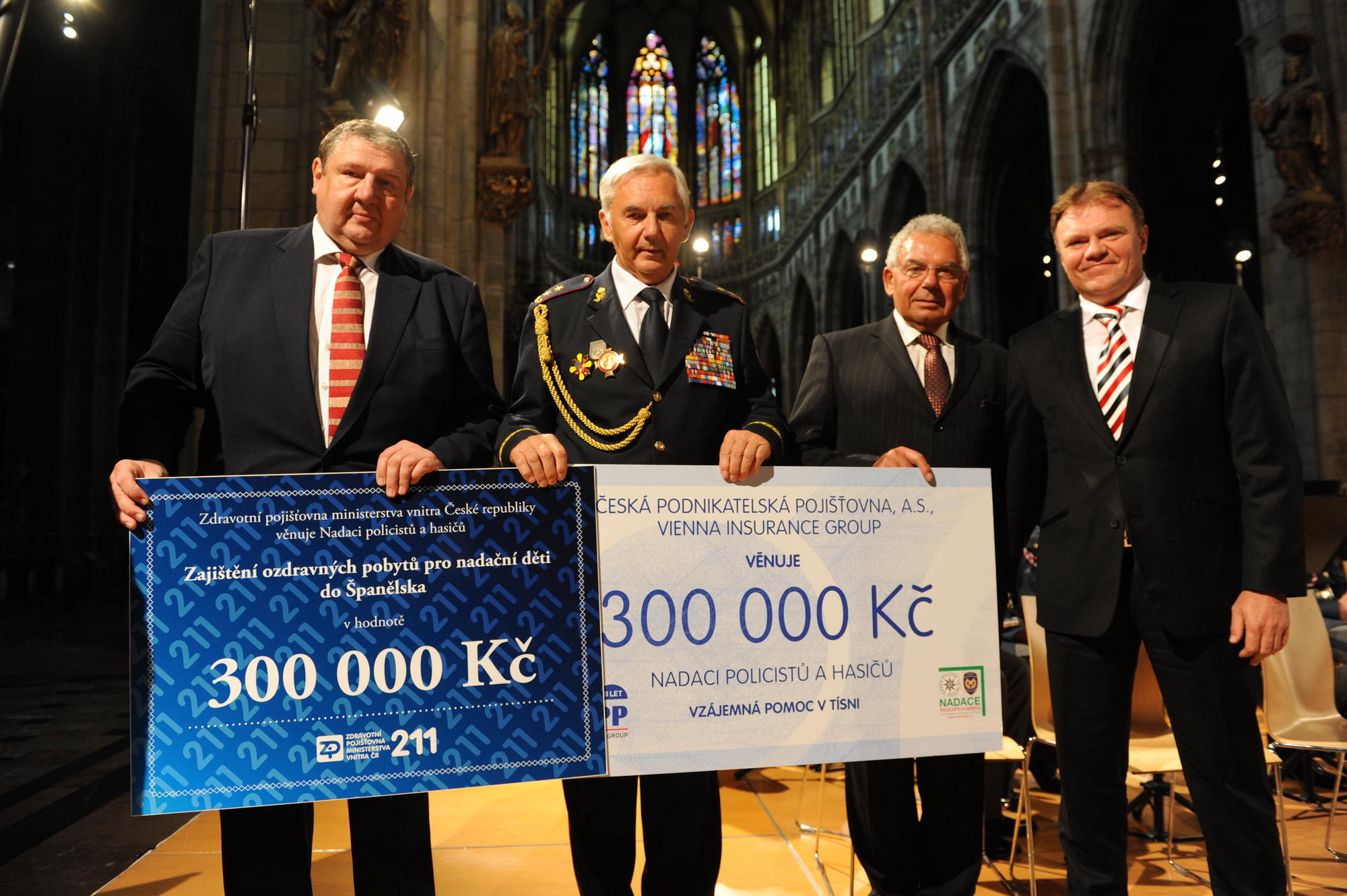 Nadaci policistů a hasičů podpořila finančním darem Zdravotní pojišťovna MV ČR, zastoupena generálním ředitelem MUDr. Davidem Kostkou, MBA, a ČPP Vienna Insurance Group, zastoupena Ing. Jaroslavem Besperátem, kteří předali po zahájení koncertu šeky členům Správní rady Nadace policistů a hasičů genmjr. Ing. Miroslavu Štěpánovi za přítomnosti ředitele nadace PhDr. Vladimíra Šutery CSc., který přítomné ujistil, že darované finance budou beze zbytku použity na pomoc nadačním rodinám.